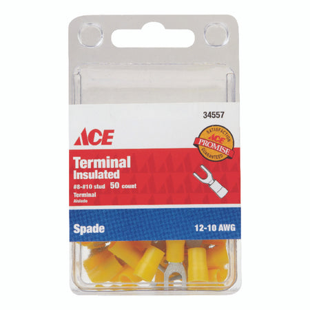 Brand Name: ACE | CSA LIsted: Yes | Color: Yellow | Number in Package: 50 pk | Packaging Type: Carded | UL Listed: Yes | Wire Range: 12-10 AWG | Wire type: Insulated Wire Terminal Insulated | Spade | 12-10 AWG | #8-#10 Stud | 50 Ct.