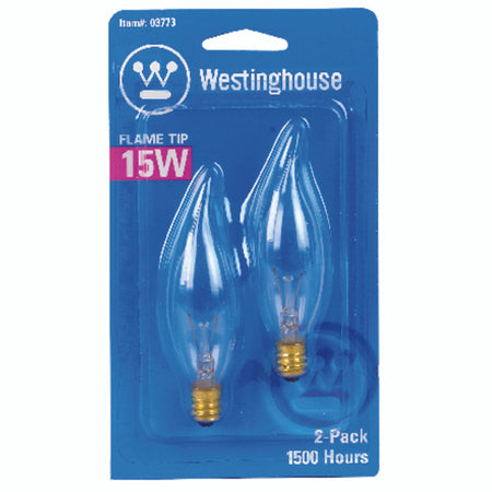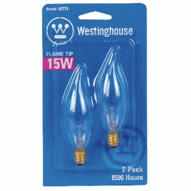 Average Rated Life: 1500 hr. | Brand Name: Westinghouse | Bulb Base Type: E12 (Candelabra) | Bulb Shape Type: E12 | Bulb Type: Decorative | California Title 20 Compliant: Yes | Color Rendering Index: 100 CRI | Color Temperature: 2700 K | Dimmable: Yes | Filament: C-7A | Finish: Clear | Light Color: Warm White | Lumens: 100 lumens | Number in Package: 2 pk | Packaging Type: Carded | Three Way Bulb: No | Volts: 120 volt | Watts: 15 watt | Indoor or Outdoor: Indoor and Outdoor Incandescent decorative light bulbs come in a variety of shapes and styles and are perfect for general lighting. These light bulbs last on average between 1000 and 3000 hour. To help you find the right bulb for the right application, see Westinghouse's full offering of decorative light bulbs including flame tip and torpedo types, as well as, popular specialty varieties. These decorative light bulbs are available with medium and candelabra screw bases and are compatible for use with standard household fixtures everything from chandeliers, fans and sconces to outdoor porch and post lanterns. | Available in multiple wattages and finishes clear, frost, white and amber | Last up to an average between 1000 and 3000 hour | Specialty varieties available including Glowescent, Flicker Flame, Flame and Star types | Specialty non-stick light bulbs feature a coated base that prevents corrosion of sockets | Completely dimmable | 100 lumen candelabra